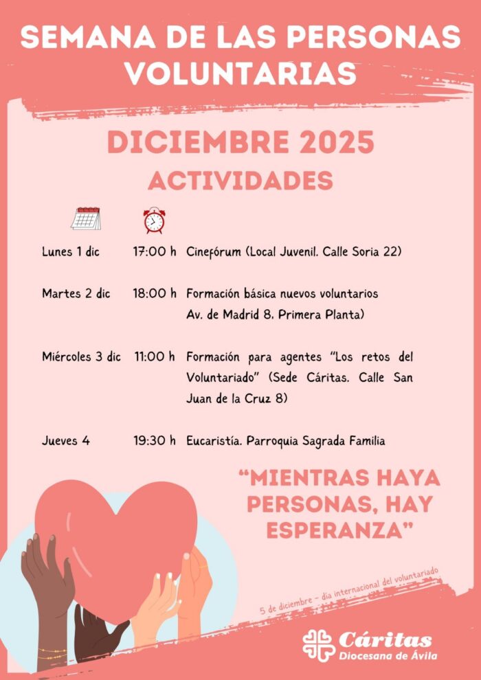 Cáritas Diocesana de Ávila celebra la Semana de las Personas Voluntarias con diversas actividades del 1 al 4 de diciembre, en torno al lema “Mientras haya personas, hay esperanza”.