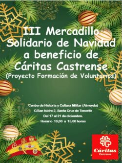 Cáritas Castrense de Tenerife celebrará del 17 al 21 de diciembre su ya tradicional Mercadillo Solidario de Navidad, que tendrá lugar en las instalaciones del Centro de Historia y Cultura Militar de Almeyda, situado en la calle San Isidro, nº 2, en Santa Cruz de Tenerife. El horario de apertura será de 10:00 a 15:00 horas.
