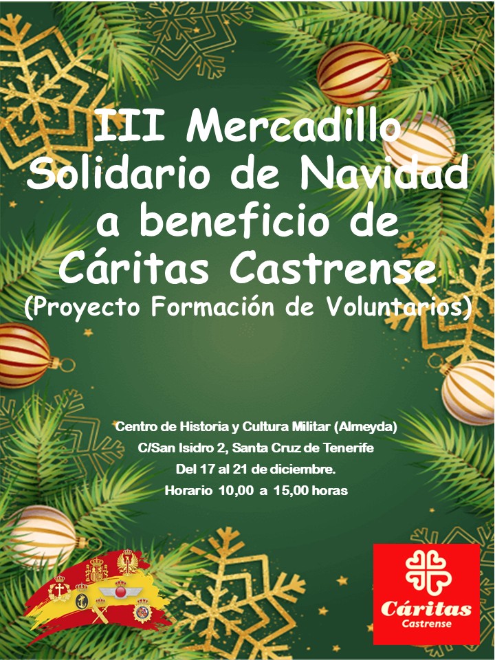 Cáritas Castrense de Tenerife celebrará del 17 al 21 de diciembre su ya tradicional Mercadillo Solidario de Navidad, que tendrá lugar en las instalaciones del Centro de Historia y Cultura Militar de Almeyda, situado en la calle San Isidro, nº 2, en Santa Cruz de Tenerife. El horario de apertura será de 10:00 a 15:00 horas.