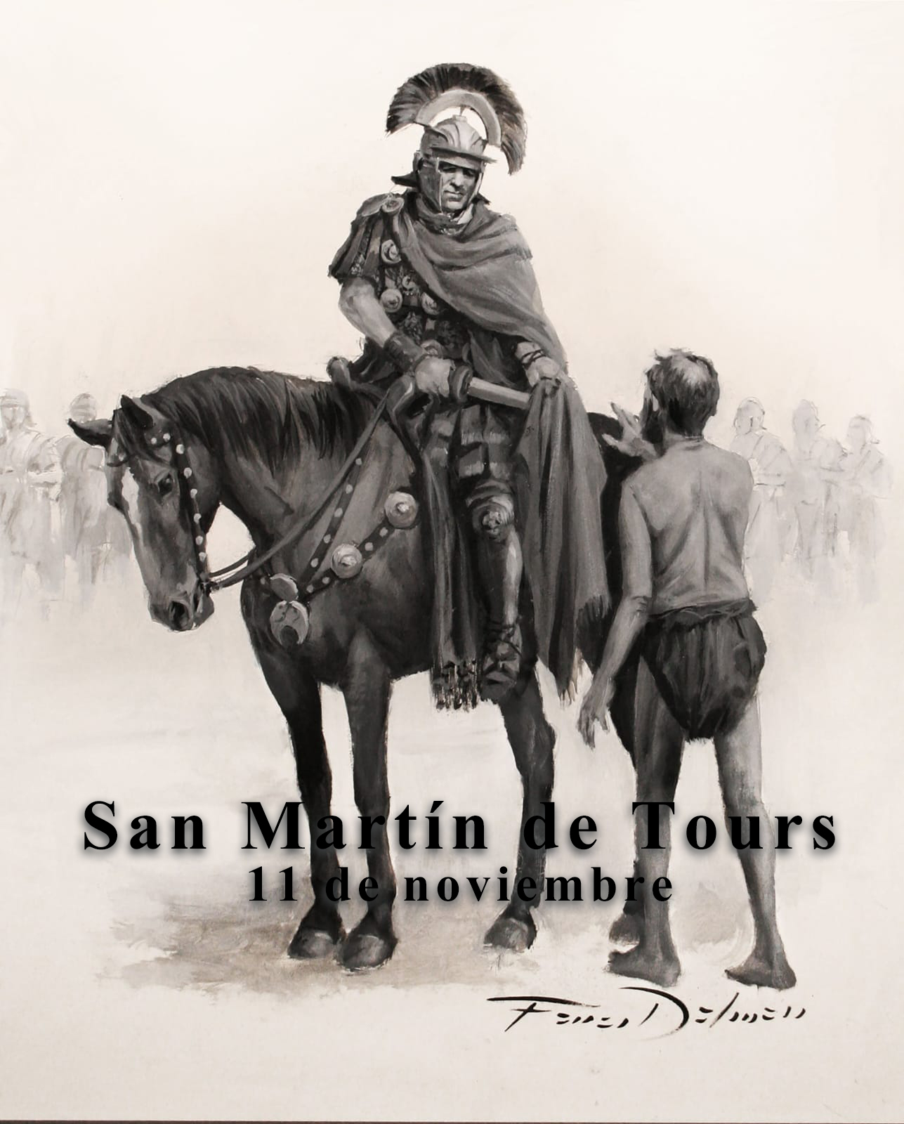 Desde los servicios centrales de Cáritas Castrense, se solicitó al pintor el diseño de una imagen de nuestro Patrón poniendo de relieve las principales características representativas de su patronazgo. Augusto Ferrer-Dalmau ha logrado representar magistralmente la condición de militar de Martín, a la vez que su humildad, aunando en su actitud la manifestación de los valores castrenses y los principios de la caridad mientras queda absolutamente explícita la dignidad del necesitado puesto en pie para recibir la ayuda de Martín, quien, a pesar de encontrarse cumpliendo su misión a lomos de caballo, no lo mira hacia abajo sino de frente y a los ojos.