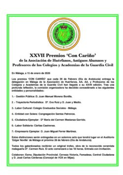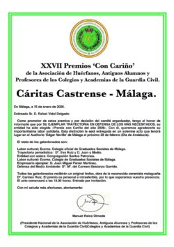 Se remite cartel y notificación a la CPC nº 15 de Málaga, de la distinción de PREMIOS CON CARIÑO DE 2026, concedida por la LABOR SOLIDARIA que hacemos en pro del colectivo castrense más necesitado de esta provincia, excepto el término municipal de Ronda.