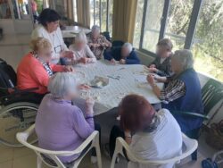 Cristina y M. Ángeles dirigieron un taller que consistió en la creación de bolitas y cruces para la confección de un rosario artesanal de un solo misterio (denario). Un grupo de 20 residentes de la primera planta nos estaba esperando con mucha ilusión de volvernos a encontrar.