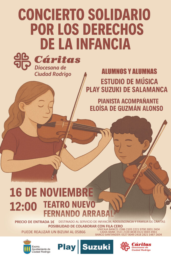 Cáritas Diocesana de Ciudad Rodrigo, a través de su Servicio de Infancia, Juventud y Familia, organiza un concierto solidario con motivo del Día Mundial de la Infancia el próximo domingo 16 de noviembre a las doce de la mañana en el teatro Nuevo “Fernando Arrabal”.